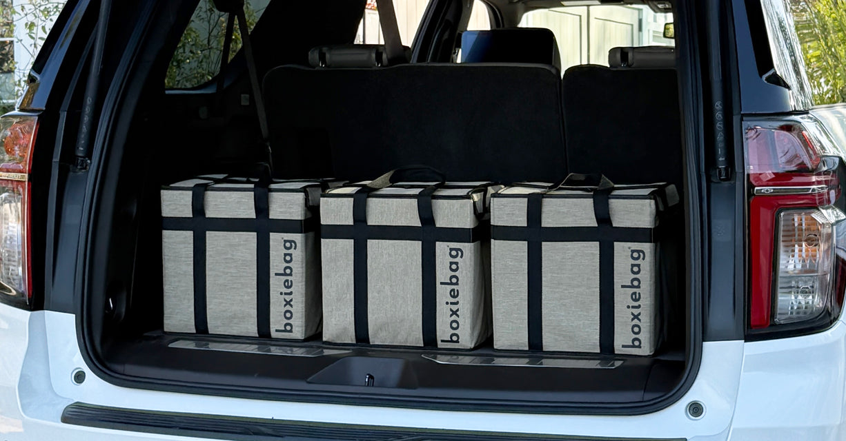 Boxiebag's patented design keeps it perfectly flat when not in use. Totes easily. Stores brilliantly.